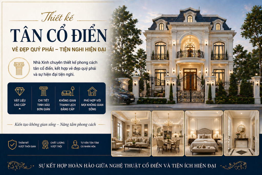 Thiết kế phong cách tân cổ điển kết hợp nét quý phái của cổ điển và sự tiện nghi của hiện đại. Loại bỏ chi tiết rườm rà, giữ lại tinh hoa thẩm mỹ, phong cách này được ưa chuộng nhờ sự thanh lịch và phù hợp với mọi không gian. Nhà Xinh mang đến giải pháp hoàn hảo theo gu thẩm mỹ của bạn.