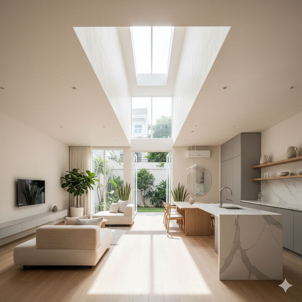 Ánh sáng tự nhiên không chỉ giúp tiết kiệm điện mà còn tạo chiều sâu thị giác cho không gian.