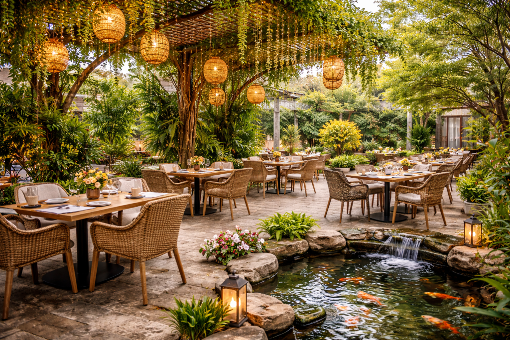 Nhà hàng sân vườn mang đến cảm giác gần gũi với thiên nhiên. Không gian thường được bố trí nhiều cây xanh, hồ nước hoặc tiểu cảnh, giúp khách hàng cảm thấy thư giãn khi dùng bữa.