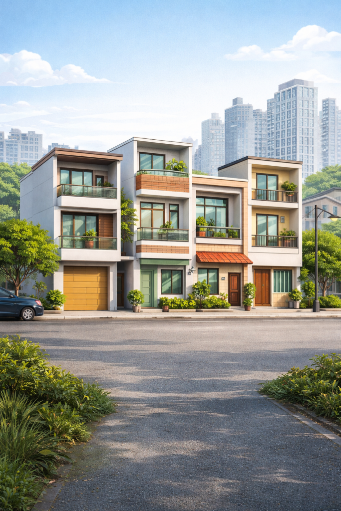 - Các căn nhà được xây dựng liền kề nhau trong khu dân cư đông đúc