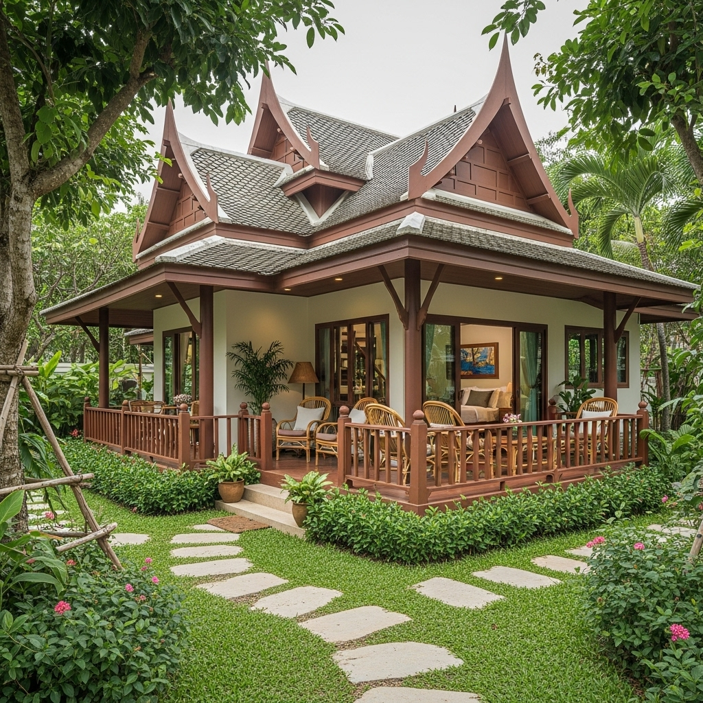 - Ưu điểm: Mái Thái giúp ngôi nhà thoáng mát, chống nóng hiệu quả, đồng thời mang lại vẻ sang trọng.