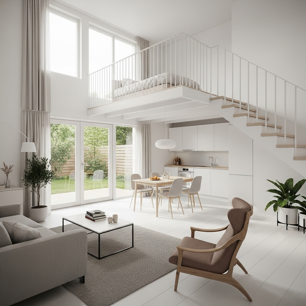 - Công năng: Tầng trệt có phòng khách, bếp, phòng ngủ; gác lửng dành cho phòng ngủ hoặc phòng làm việc.