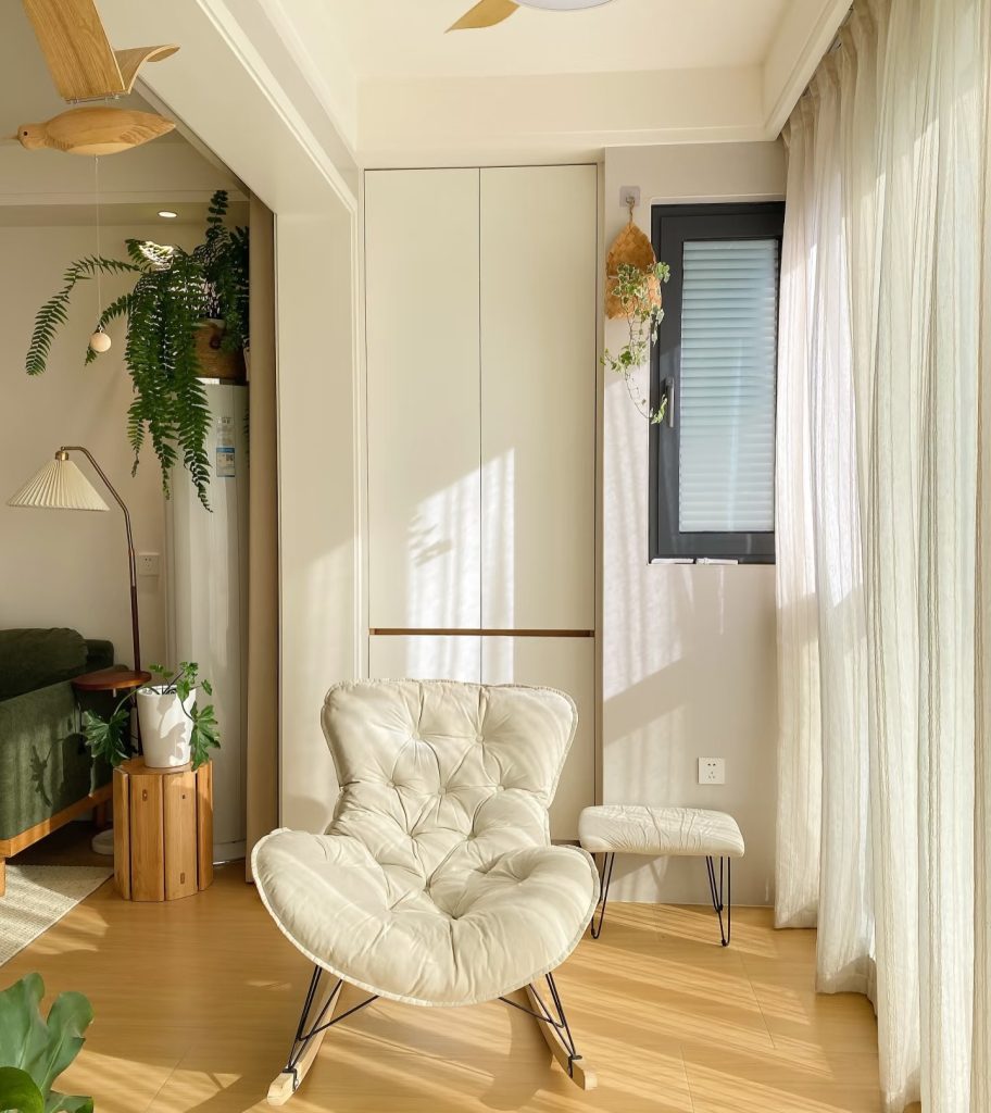 Dù diện tích không lớn, căn hộ vẫn có một góc chill riêng. Chiếc ghế bập bênh đặt cạnh cửa sổ. Đây là nơi lý tưởng để đọc sách hoặc uống trà.