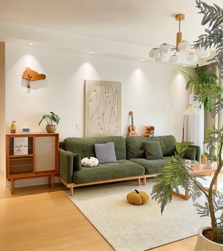 Phòng khách mang đậm tinh thần phong cách Japandi với bảng màu trung tính. Tông trắng kem, be và gỗ sáng tạo cảm giác nhẹ nhàng. Chiếc sofa băng màu xanh rêu nhung nỉ là điểm nhấn tinh tế. Gam màu này mang thiên nhiên vào không gian sống.