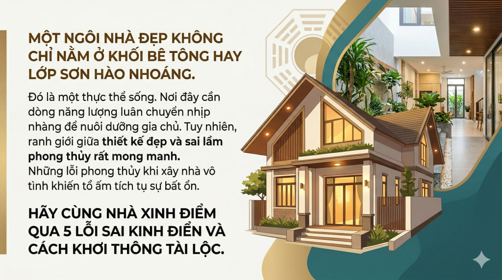Một ngôi nhà đẹp không chỉ nằm ở khối bê tông hay lớp sơn hào nhoáng. Đó là một thực thể sống. Nơi đây cần dòng năng lượng luân chuyển nhịp nhàng để nuôi dưỡng gia chủ. Tuy nhiên, ranh giới giữa thiết kế đẹp và sai lầm phong thủy rất mong manh. Những lỗi phong thủy khi xây nhà vô tình khiến tổ ấm tích tụ sự bất ổn.