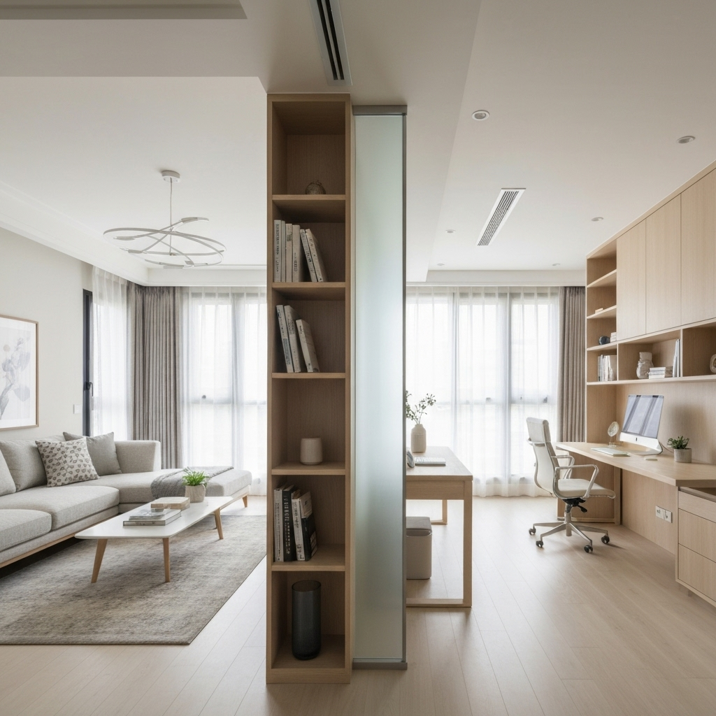 💡 Ví dụ: Một kệ gỗ chia giữa phòng khách và bàn làm việc vừa đủ phân khu, vừa làm điểm nhấn nội thất đẹp mắt.